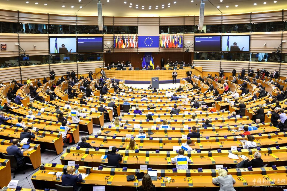 2022年3月1日,在比利時布魯塞爾舉行的歐洲議會全會上,烏克蘭總統(tǒng)澤連斯基遠程發(fā)表演講。新華社發(fā)(歐盟供圖)