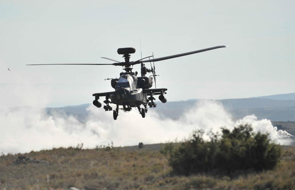 2015年11月4日,在西班牙薩拉戈薩舉行的陸空聯(lián)合作戰(zhàn)演習(xí)中,“阿帕奇”武裝直升機進入演習(xí)區(qū)域。新華社記者謝海寧攝