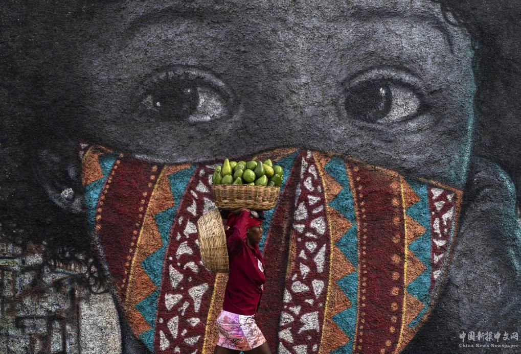2021年8月24日,一名女子頭頂水果走在海地太子港街頭。新華社發(fā)(戴維·德拉帕斯攝)