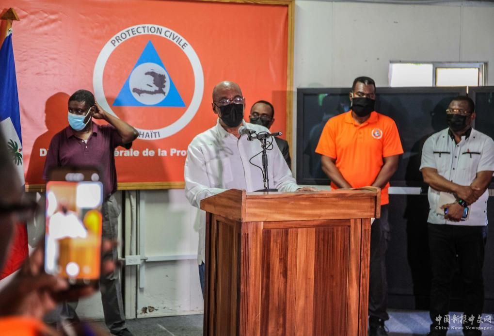 2021年8月14日,海地總理亨利(前)在太子港舉行的新聞發(fā)布會(huì)上講話。新華社發(fā)(理查德·皮耶林?jǐn)z)