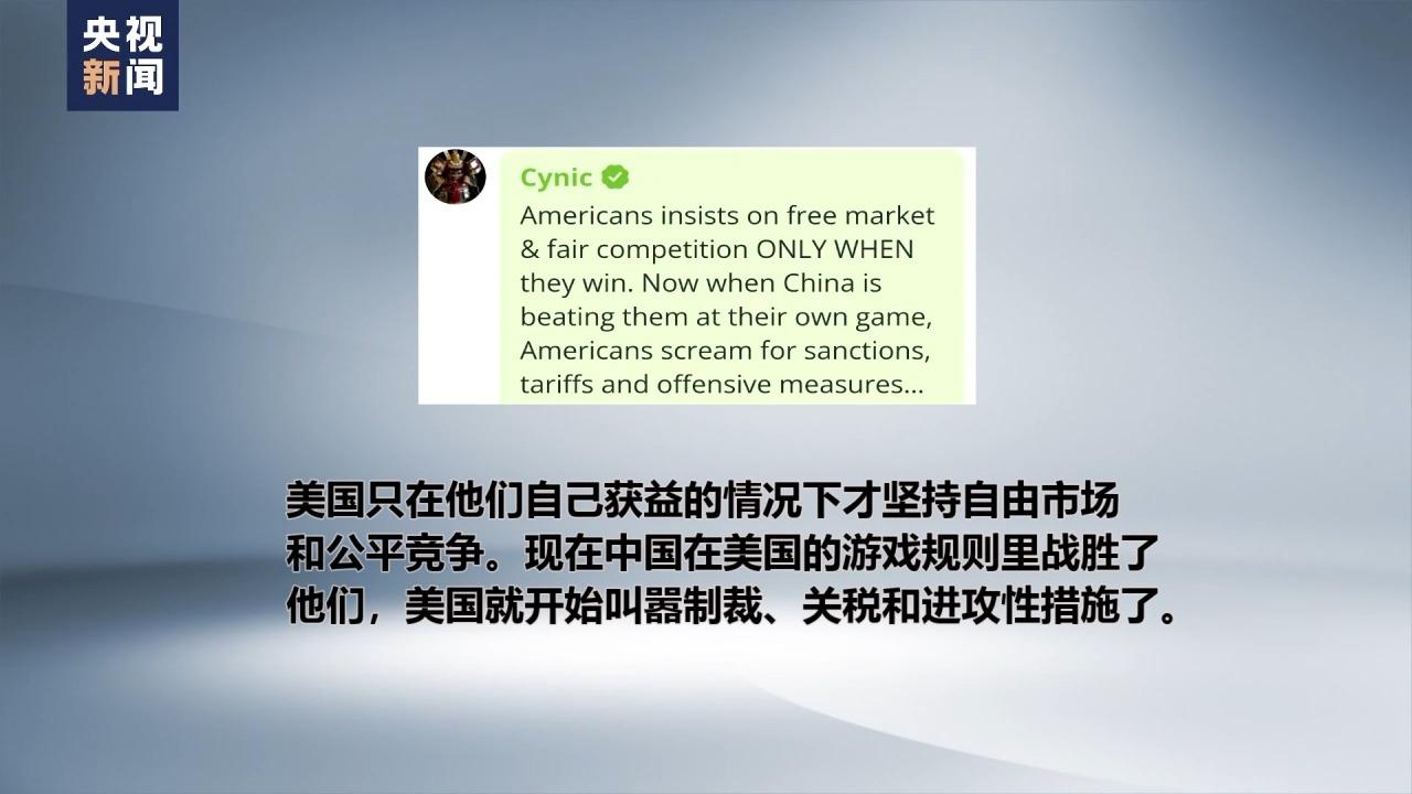 還有網(wǎng)友批評(píng)稱,“美國(guó)只在他們自己獲益的情況下才堅(jiān)持自由市場(chǎng)和公平競(jìng)爭(zhēng)?,F(xiàn)在中國(guó)在美國(guó)的游戲規(guī)則里戰(zhàn)勝了他們,美國(guó)就開始叫囂制裁、關(guān)稅和進(jìn)攻性措施了。”
