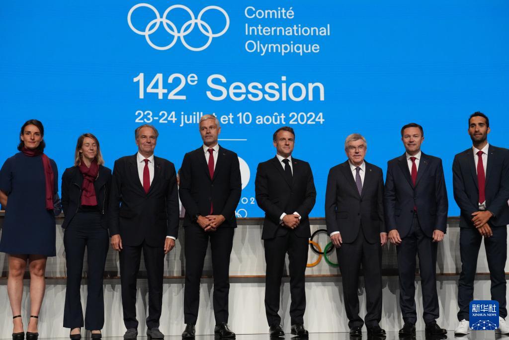 7月24日,法國總統(tǒng)馬克龍(右四)、國際奧委會(huì)主席巴赫(右三)等在會(huì)議現(xiàn)場合影。