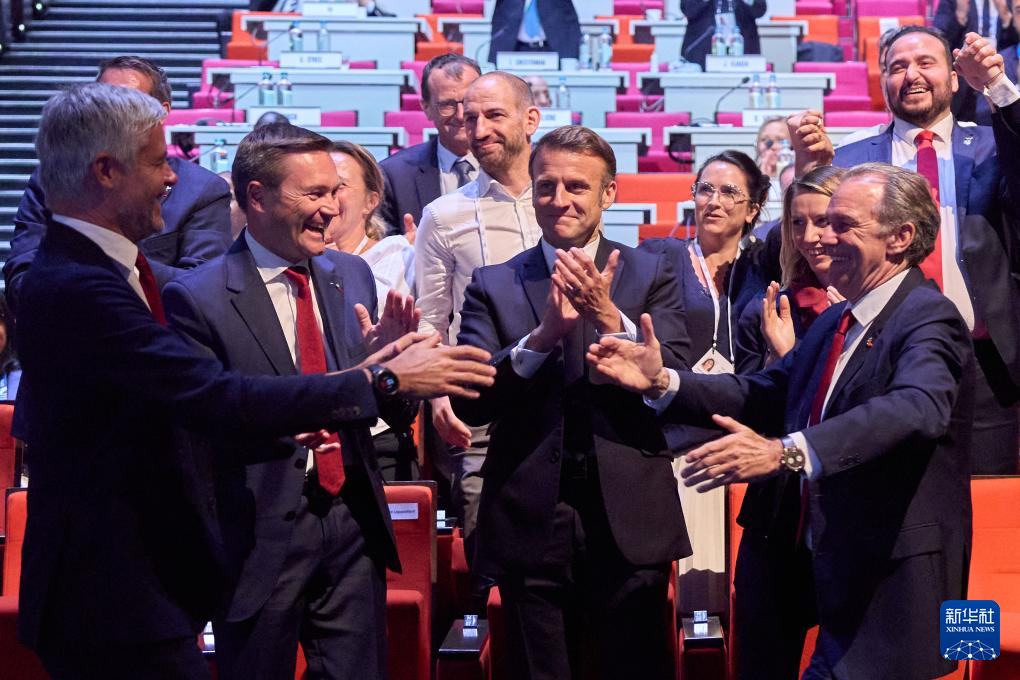 7月24日,法國總統(tǒng)馬克龍(前中)與法國代表團(tuán)成員慶祝阿爾卑斯山地區(qū)獲得2030年冬奧會(huì)舉辦權(quán)。
