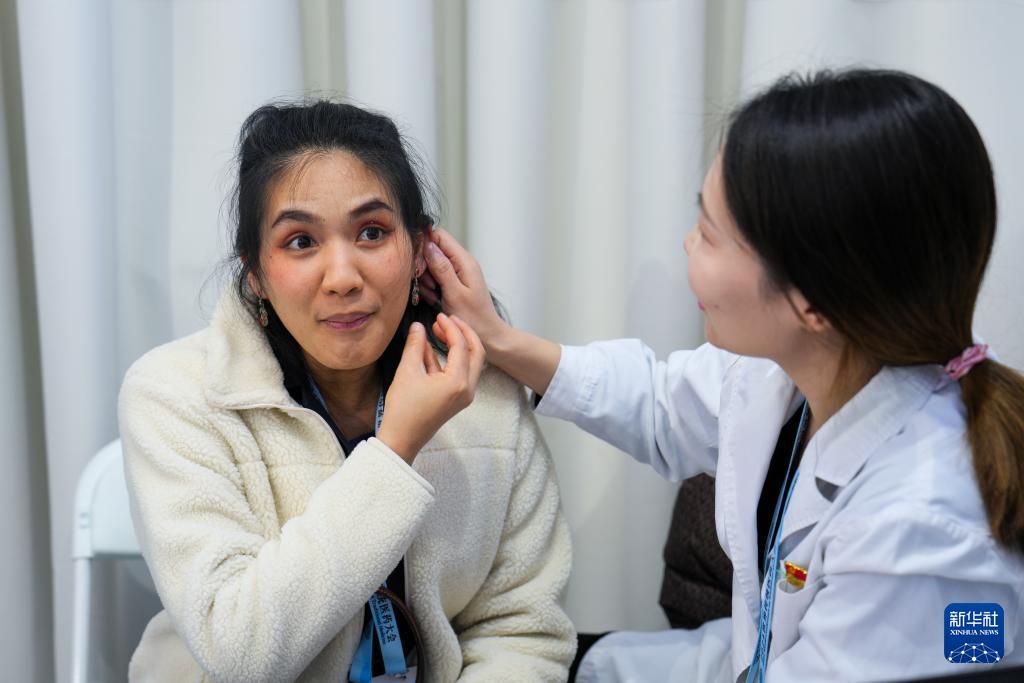 12月3日,在2024世界傳統(tǒng)醫(yī)藥大會(huì)的中醫(yī)藥體驗(yàn)區(qū),一名來(lái)自泰國(guó)的參會(huì)嘉賓(左)在首都醫(yī)科大學(xué)附屬北京中醫(yī)醫(yī)院的展位體驗(yàn)耳穴壓豆。