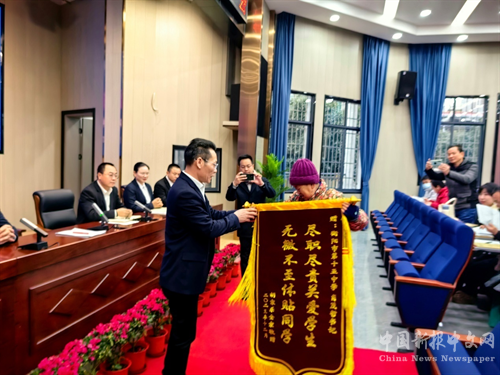 新春的喜慶之中有一股暖暖的春風(fēng)吹過,2023屆畢業(yè)生胡家樂的奶奶特意趕到學(xué)校,滿懷感激之心,將繡有“無微不至體貼同學(xué),盡職盡責(zé)關(guān)愛學(xué)生”的一面錦旗送到報(bào)告廳,以此表達(dá)對肖茂哲書記和學(xué)校的衷心感謝!