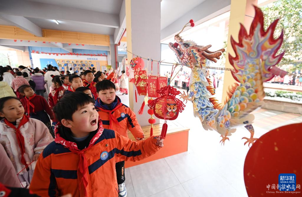 2月26日,湖北省襄陽市海容小學(xué)學(xué)生在校園觀賞剪紙繪畫燈籠等作品。