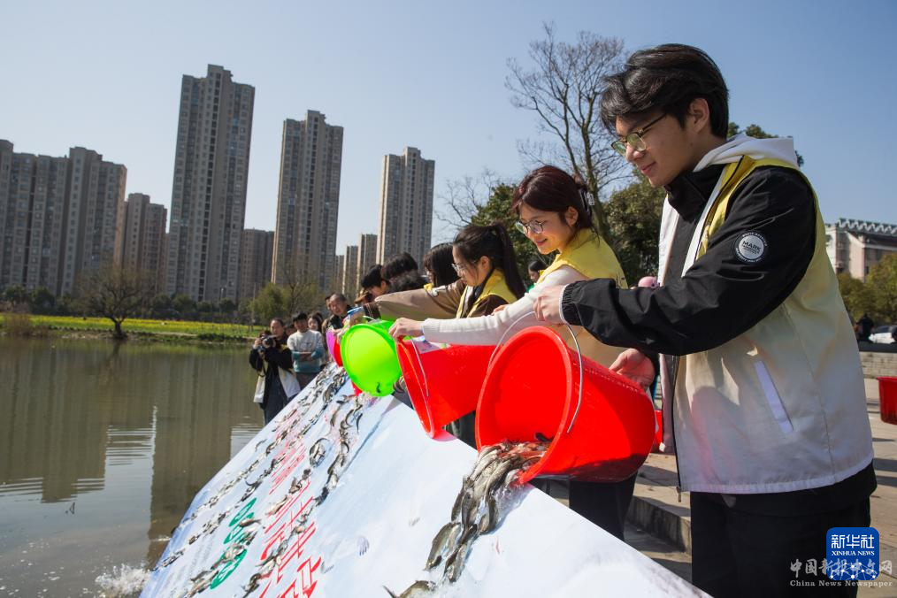 3月21日,在浙江省寧波市北侖區(qū)柴橋街道葦葉公園,志愿者放流魚(yú)苗,改善水域生態(tài)環(huán)境。