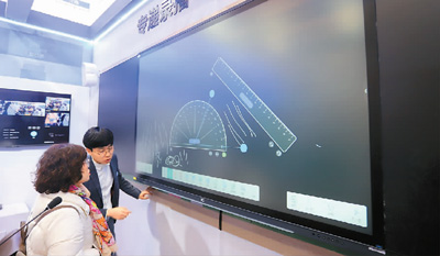 觀眾在首屆江蘇(蘇州)教育裝備展上參觀智慧黑板。