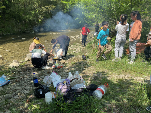 中午,師生開始安鍋壘灶、生火做飯。溪邊樹蔭下,炊煙裊裊,熱鬧非凡。大家齊動手,分工有序,密切配合,爭先恐后“展廚藝”“亮本領(lǐng)”,幾經(jīng)周折,一桌桌豐盛美味的野外大餐便“大功告成”。大伙兒席地而坐,你嘗一口,我夾一筷,甜蜜地分享自己的勞動果實,快樂與自豪洋溢在臉上?;顒咏Y(jié)束時,各班同學(xué)主動拾走垃圾,清理現(xiàn)場,將垃圾帶回,自覺保護(hù)環(huán)境衛(wèi)生。