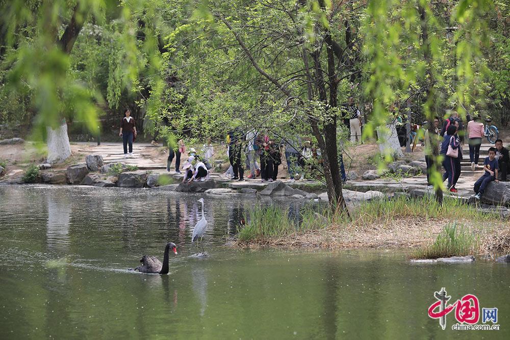游客在北大未名湖畔被湖中水禽吸引目光。中國網(wǎng) 趙娜攝影