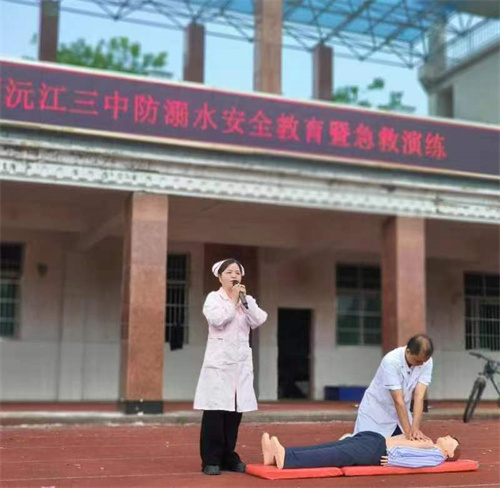 活動現(xiàn)場,沅江市黃茅洲鎮(zhèn)中心衛(wèi)生院醫(yī)護(hù)人員采用“講、演、練”結(jié)合”的方式,為師生帶來了一場生動的防溺水安全教育及急救知識宣講。講解員詳細(xì)講解發(fā)生溺水事故如何自救與互救的知識,醫(yī)護(hù)人員分步演示心肺復(fù)蘇的動作和流程。隨后,部分學(xué)生在醫(yī)護(hù)人員的指導(dǎo)下實操實練,輪流在模擬人教具上進(jìn)行心肺復(fù)蘇操作練習(xí)。