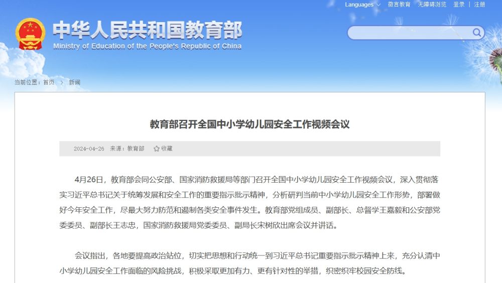 4月26日,教育部會同公安部、國家消防救援局等部門召開全國中小學(xué)幼兒園安全工作視頻會議,深入貫徹落實(shí)習(xí)近平總書記關(guān)于統(tǒng)籌發(fā)展和安全工作的重要指示批示精神,分析研判當(dāng)前中小學(xué)幼兒園安全工作形勢,部署做好今年安全工作,盡最大努力防范和遏制各類安全事件發(fā)生。教育部黨組成員、副部長、總督學(xué)王嘉毅和公安部黨委委員、副部長王志忠,國家消防救援局黨委委員、副局長宋樹欣出席會議并講話。
