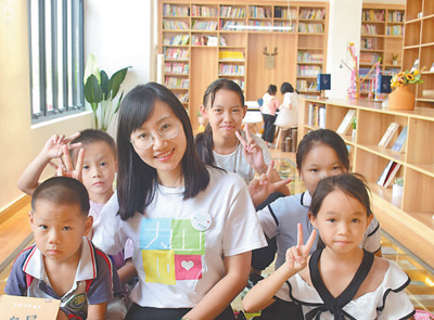 圖為望謨縣蟠桃街道平朗社區(qū)圖書館內(nèi),周蓓蕾和孩子們在一起。 |