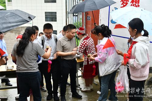 6月20日,在貴州省凱里市灣水鎮(zhèn)長(zhǎng)坡村,長(zhǎng)坡小學(xué)師生為中國(guó)海油深圳分公司愛(ài)心人士敬獻(xiàn)紅蛋和粽子。(陳丹 攝)