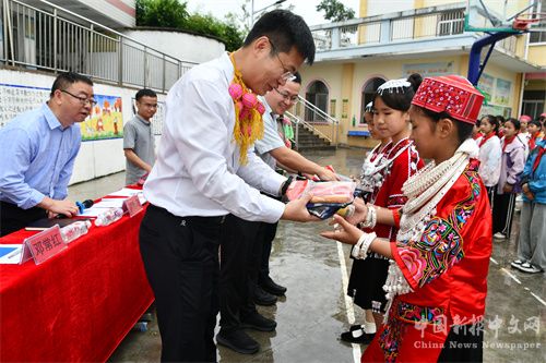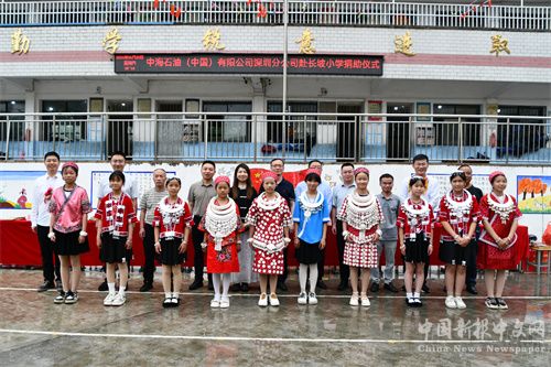 6月20日,在貴州省凱里市灣水鎮(zhèn)長(zhǎng)坡村,中國(guó)海油深圳分公司赴長(zhǎng)坡小學(xué)捐助儀式現(xiàn)場(chǎng)合影。(陳丹 攝)