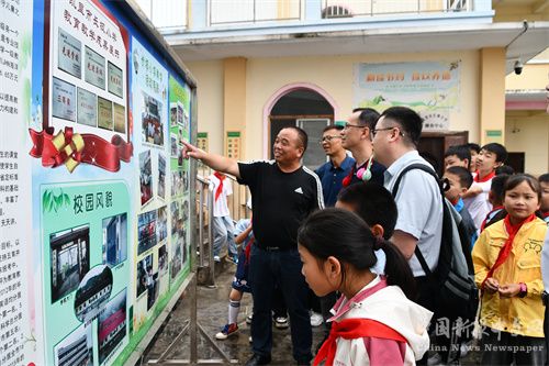 6月20日,在貴州省凱里市灣水鎮(zhèn)長(zhǎng)坡村,長(zhǎng)坡小學(xué)校長(zhǎng)向中國(guó)海油深圳分公司愛(ài)心人士介紹學(xué)校情況。(陳丹 攝)