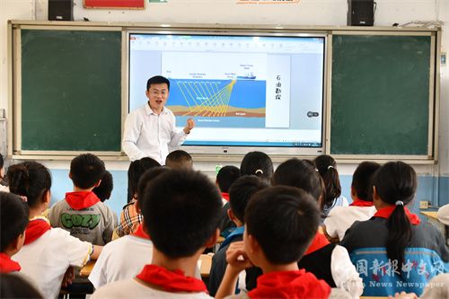 6月20日,中國(guó)海油深圳分公司陸豐油田作業(yè)區(qū)生產(chǎn)經(jīng)理趙迎濤在貴州省凱里市灣水鎮(zhèn)長(zhǎng)坡小學(xué)六年級(jí)教室,運(yùn)用多媒體教學(xué)給67名高年級(jí)學(xué)生上《海洋石油世界》科普課。