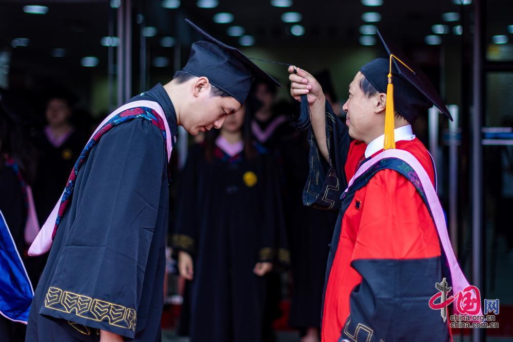 畢業(yè)生導(dǎo)師為學(xué)生撥穗。中國網(wǎng)記者 鄭亮攝