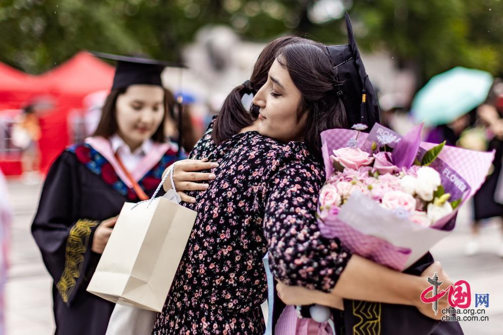 走出畢業(yè)典禮會(huì)場(chǎng)的學(xué)生與家長相擁慶祝。中國網(wǎng)記者 鄭亮攝