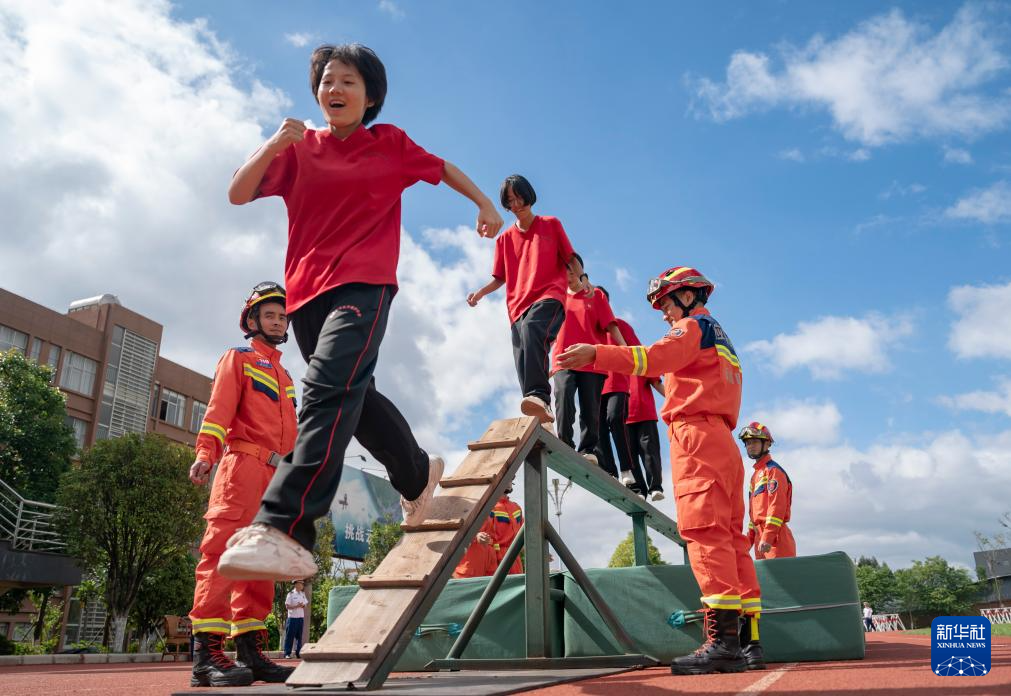 7月16日,華坪女高學(xué)生在消防員協(xié)助下過平衡木。