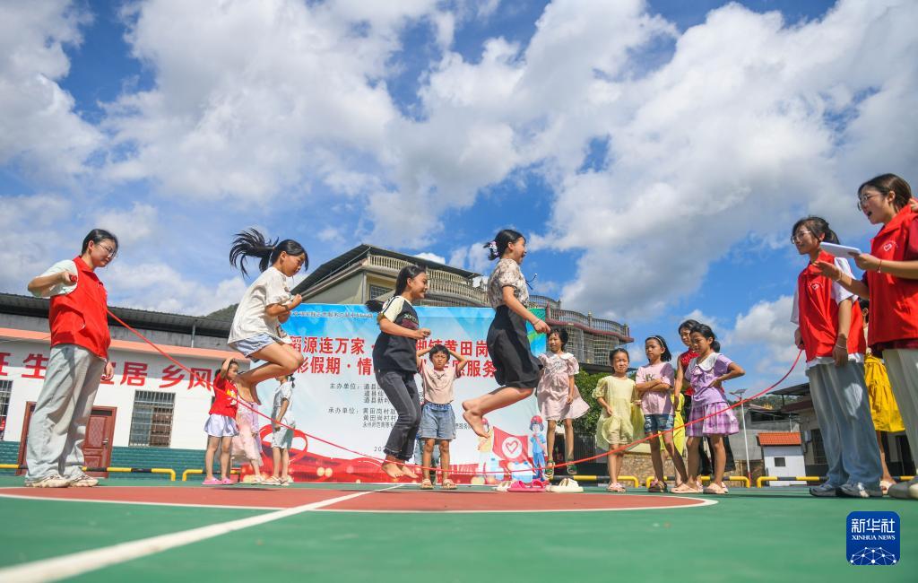 7月17日,在湖南省永州市道縣仙子腳鎮(zhèn)黃田崗村,孩子們和志愿者一起跳繩。