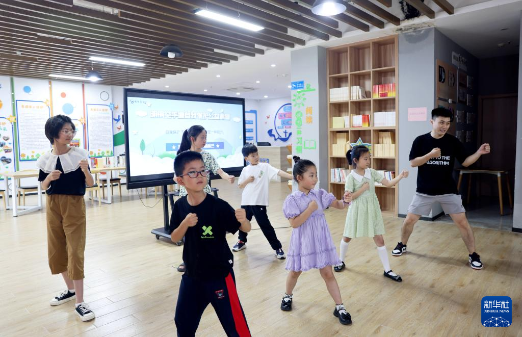 7月17日,在江蘇省揚(yáng)州市江都區(qū)仙女鎮(zhèn)建樂(lè)社區(qū),公益講師帶領(lǐng)小朋友一起練習(xí)空手道。