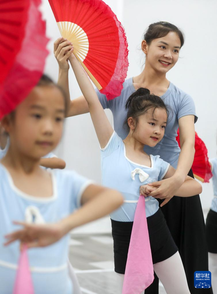 7月17日,在貴州省開陽(yáng)縣一家舞蹈培訓(xùn)中心,老師指導(dǎo)小朋友練習(xí)舞蹈。
