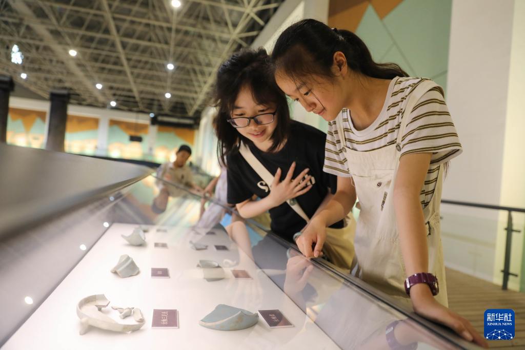 7月17日,孩子們?cè)诤幽鲜氊S清涼寺汝官窯遺址展示館觀看汝瓷殘片。