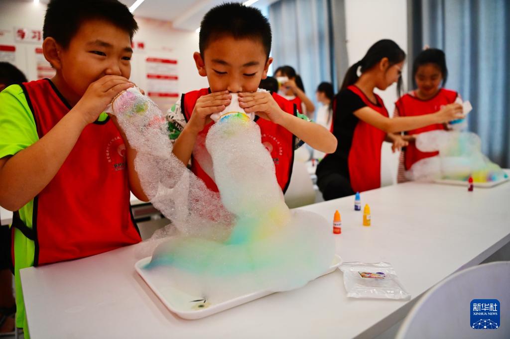 7月17日,在山東省聊城市東昌府區(qū)侯營(yíng)鎮(zhèn)侯營(yíng)村假期實(shí)驗(yàn)小課堂,小學(xué)生在做“彩虹泡泡龍”趣味化學(xué)實(shí)驗(yàn)。