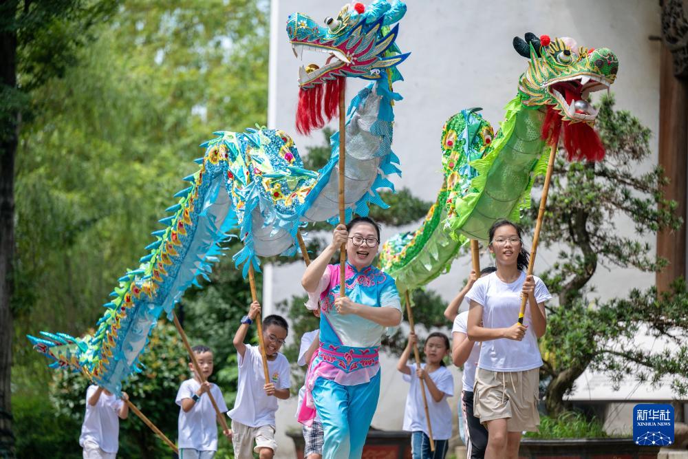 7月17日,在浙江省湖州市長(zhǎng)興縣李家巷鎮(zhèn)石泉村文化禮堂,暑托班的孩子在體驗(yàn)舞龍。