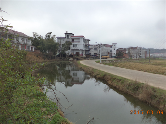 西向東伸至校前怱然轉北一甩,象母親身上一根偎依嬰兒的綁帶,將它緊緊地扣在懷里;越過白色、寬廣、熱鬧的沙路,兩口碧波蕩漾的大魚塘,象一雙明亮的大眼睛相嵌在它的“臉盤” 上;前邊便是千畝連片的大垅田,春來菜花黃燦燦,夏來禾苗綠油油,秋來稻熟翻金浪;十里黃公江穿行在這美麗的田野,沿岸的花草樹木,將它的流水濾得沙明水清;一座古老的石拱橋似飽經風霜老農粗陋的雙腿,橫跨在這東端的河面上……