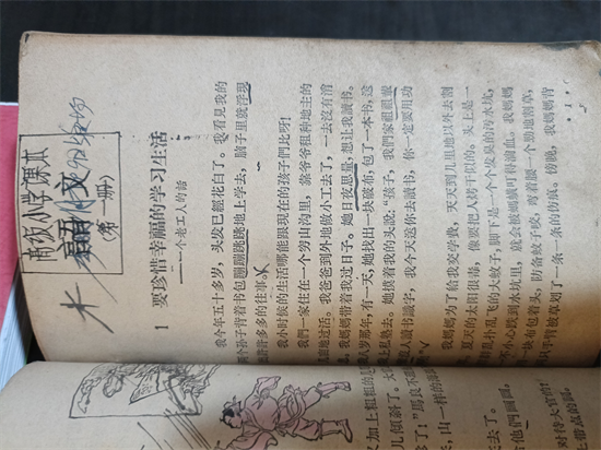 入學的第二天,班主任老師周俊雅就為我們發(fā)上了一套嶄新的課本,有語文、算術、自然和地理。新課表貼在教室進門口的墻上,上午4節(jié),下午2節(jié),主要課程是語文,也是我最感興趣的學科。