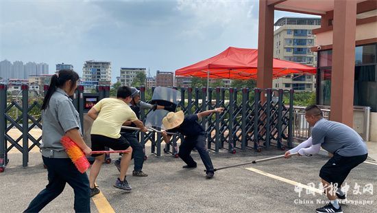 現(xiàn)場(chǎng)模擬事發(fā)場(chǎng)景:中午12:30時(shí),演練開始。學(xué)校正是中午就餐時(shí)間,一男子手持長(zhǎng)刀翻越安檢門直接闖入學(xué)校,安保人員見到此情況馬上報(bào)告總指揮,賀佳新副校長(zhǎng)接到發(fā)生校園暴力消息后,立即啟動(dòng)學(xué)校反恐防暴應(yīng)急預(yù)案,陽越老師帶領(lǐng)應(yīng)急小分隊(duì)前往現(xiàn)場(chǎng)與保安人員控制暴力分子跑進(jìn)校園,曾素蘭同志迅速安排老師們指揮操場(chǎng)上的學(xué)生,依次、迅速疏散到教室,并撥打報(bào)警電話110。