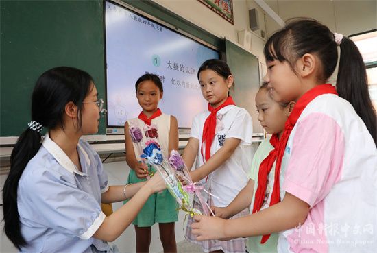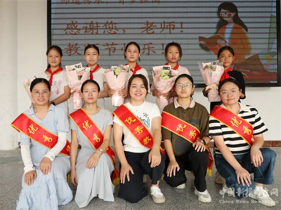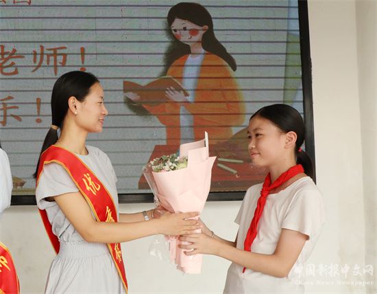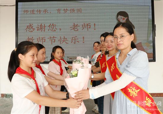 9月10日,在湖南省保靖縣清水坪學校,學生向老師獻花。當日是教師節(jié),該學校關工委組織開展“感謝老師”主題活動,學生們以行敬師禮、手工制作禮物、獻花等方式表達對老師的感恩之情。(俞采華 陳亞平)
