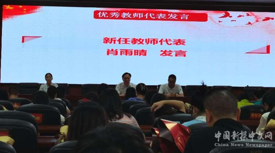 新任教師代表肖雨晴以飽滿的熱情和堅定的信念,表達了自己作為一名新任教師的憧憬和決心。她將傳承勵志、善學、求美、創(chuàng)新的育人方針,以學生為本,敬業(yè)樂群,無私奉獻,誨人不倦,認真上好每一堂課。本著勤奮、向上、樂業(yè)的態(tài)度,努力工作,爭取早日成為一名合格的中學教師,成為一名優(yōu)秀的中學教師!
