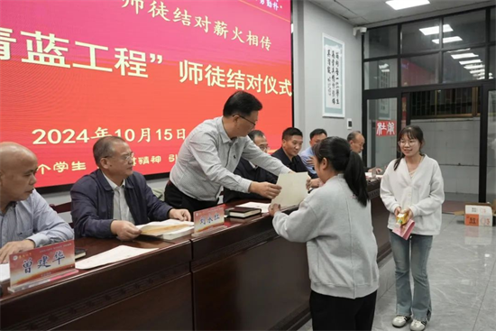 校領(lǐng)導(dǎo)為青藍(lán)工程“師傅”頒發(fā)“指導(dǎo)教師”聘書。之后,“徒弟”向“師傅”行拜師禮,并合影留念。
