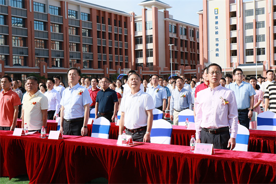 慶典現(xiàn)場彩旗飄揚、鮮花簇?fù)?,氣氛熱烈而莊重。嘉賓們在簽名墻留下祝福后,早上八點半鐘,揭牌儀式正式開始,劉喜鋒校長主持。在激昂的音樂聲中,陽春市人民政府副市長曾慶嬋女士、陽江市教育局黨組成員副局長黃教先生、陽春市教育局書記謝銳先生、原廣東省紅十字會黨組書記陳文昌先生、陽江市農(nóng)業(yè)銀行江城支行行長黃永良先生、陽江市公安局原副局長、原陽江海關(guān)輯私局長歐少勇先生等嘉賓共同為陽春高新職業(yè)技術(shù)學(xué)校揭牌,金色校名在陽光下熠熠生輝,標(biāo)志著學(xué)校正式開啟新征程,肩負(fù)起培養(yǎng)大國工匠的使命。