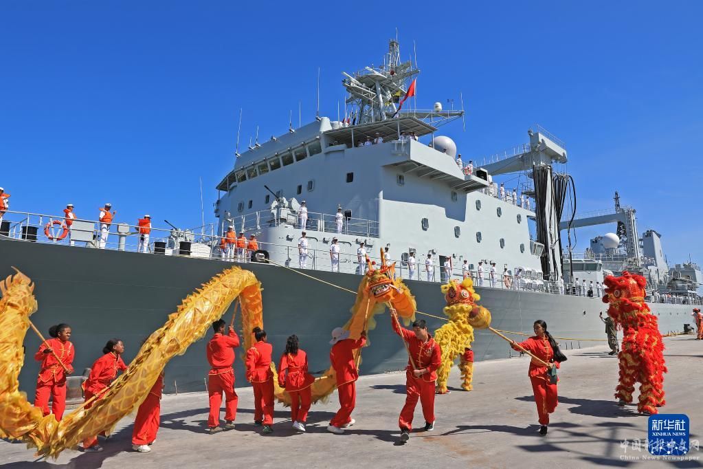歡迎儀式上,馬方組織了舞龍、舞獅和當(dāng)?shù)靥厣璧副硌?,學(xué)生代表為編隊指揮員獻上鮮花。儀式結(jié)束后,歡迎人群分批次登艦參觀。