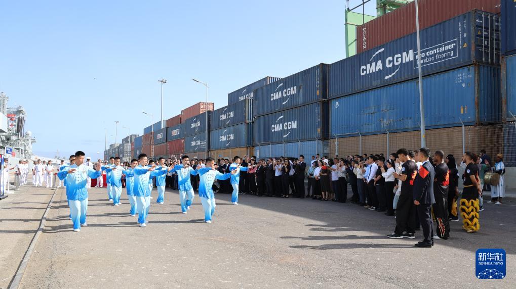 7月10日,中國(guó)海軍第46批護(hù)航編隊(duì)焦作艦官兵在摩洛哥卡薩布蘭卡港碼頭向歡迎人群展示水兵太極拳。
