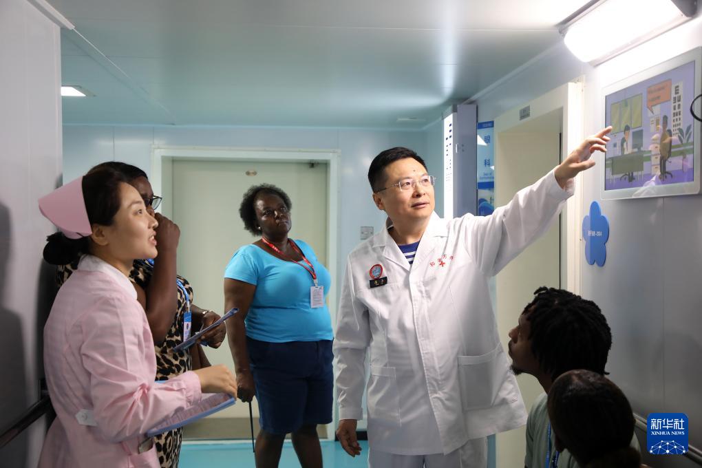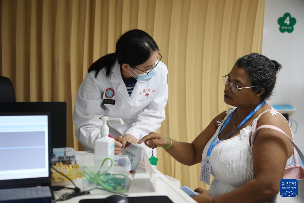 7月6日,醫(yī)務(wù)人員在中國(guó)海軍“和平方舟”號(hào)醫(yī)院船上為塞舌爾民眾提供醫(yī)療服務(wù)。