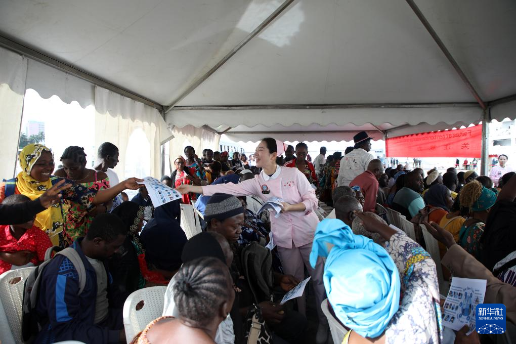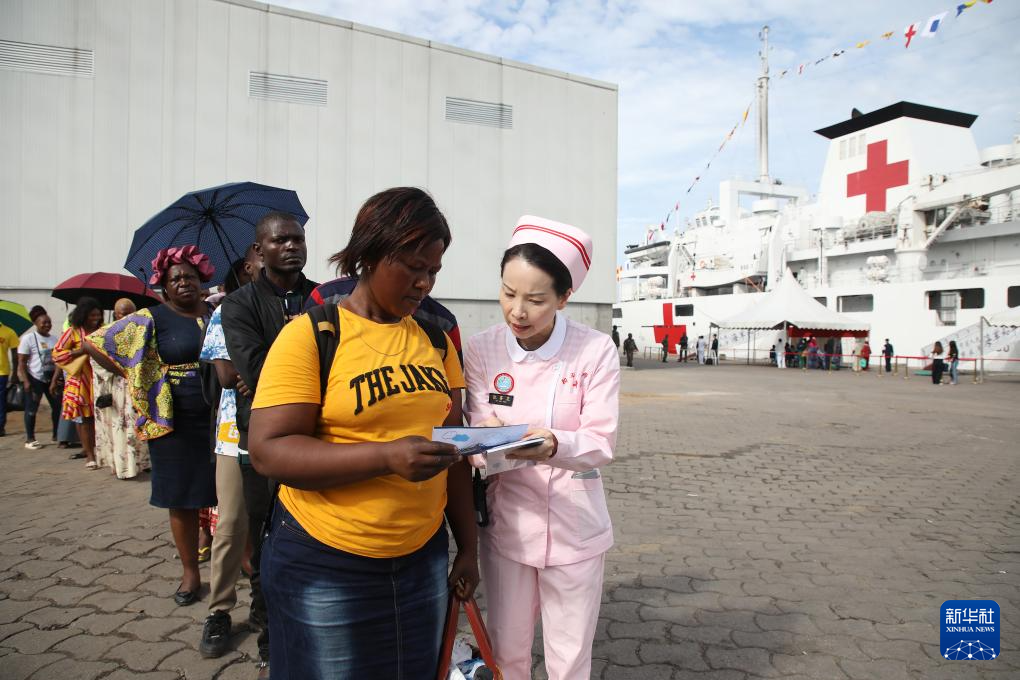 10月10日,中國(guó)海軍“和平方舟”號(hào)醫(yī)院船在喀麥隆開(kāi)展活動(dòng),醫(yī)務(wù)人員發(fā)放宣傳手冊(cè)。