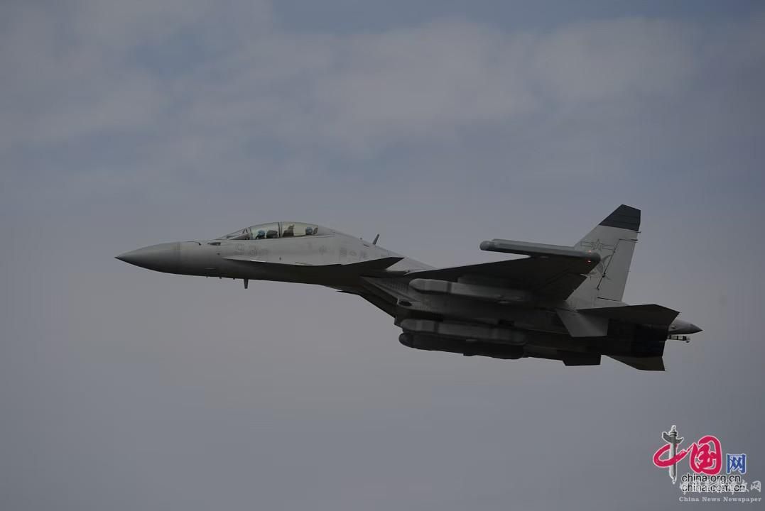 11月9日,海軍殲-15系列艦載機(jī)編隊(duì)在珠海進(jìn)行適應(yīng)性訓(xùn)練,殲-15D首次公開亮相。殲-15D是一型雙座艦載電子戰(zhàn)飛機(jī),集電子干擾及打擊等能力于一體,可在未來航母編隊(duì)奪取制空權(quán)中發(fā)揮重要作用。中國網(wǎng)記者 楊佳 攝影