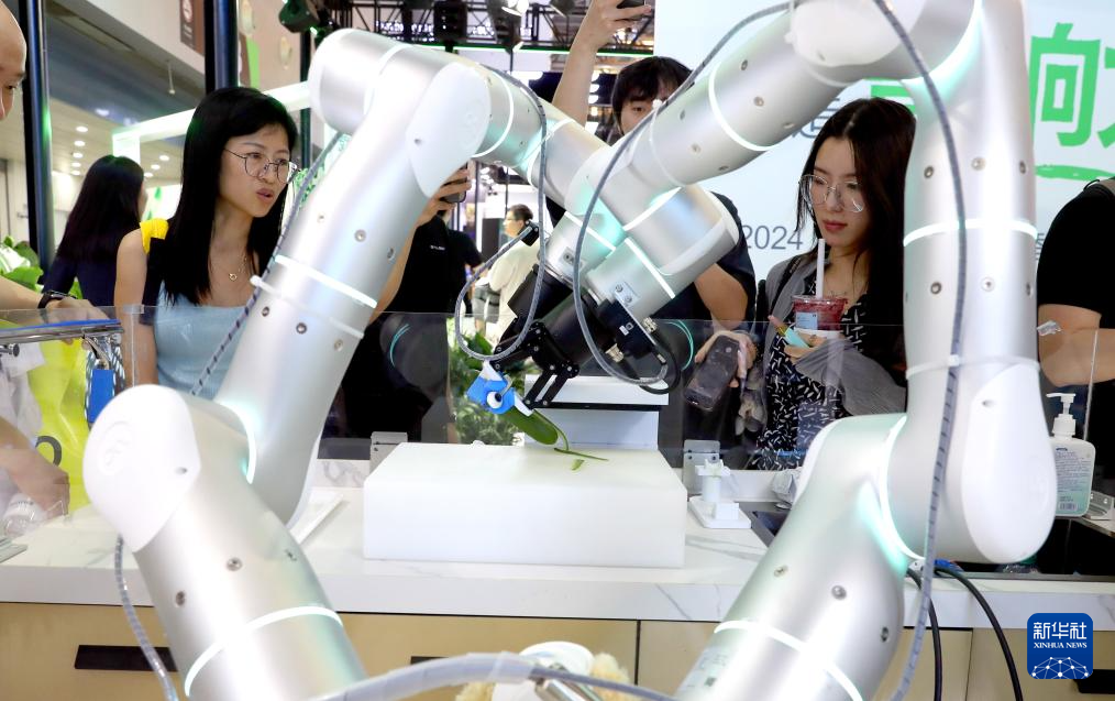 7月4日,參觀者在一個演示削黃瓜皮的機器人前駐足觀看。
