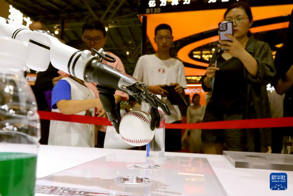 7月5日,一個裝備仿生手的機器人在演示抓取動作。