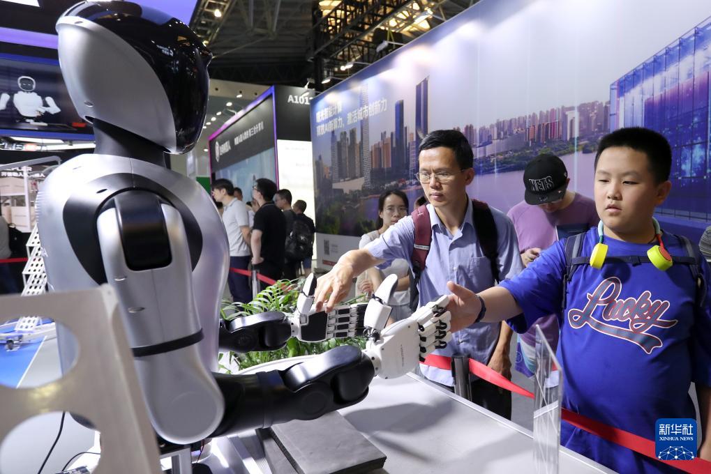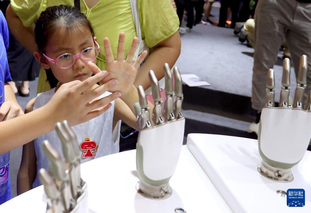 7月5日,參觀者在觸摸感受機器人的仿生機械手。