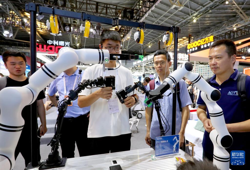 7月5日,一名工作人員(中)在演示仿生機械臂的抓取動作。