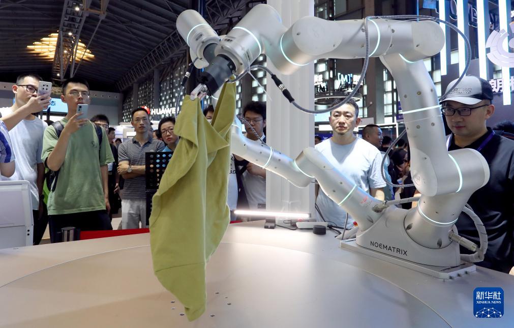 7月5日,一個機器人在展臺上進(jìn)行疊衣服技能演示。