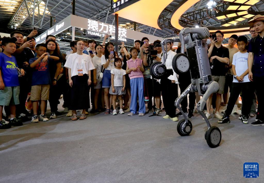 7月5日,一個四足輪式機器人在進(jìn)行倒立行走技能展示。
