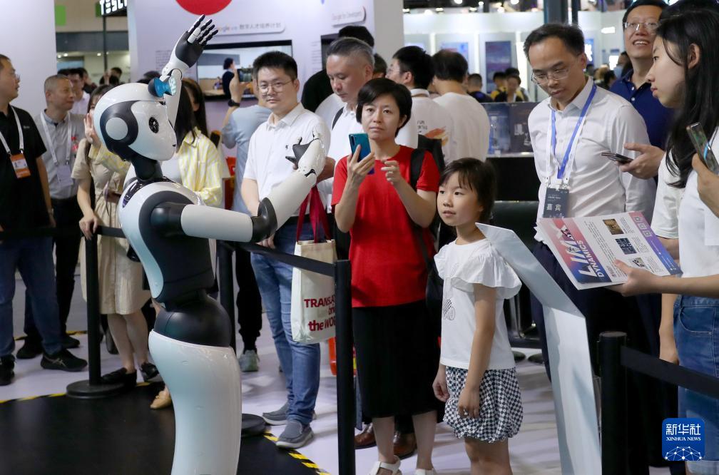 7月5日,參觀者在觀看一個進(jìn)行舞蹈表演的機器人。
