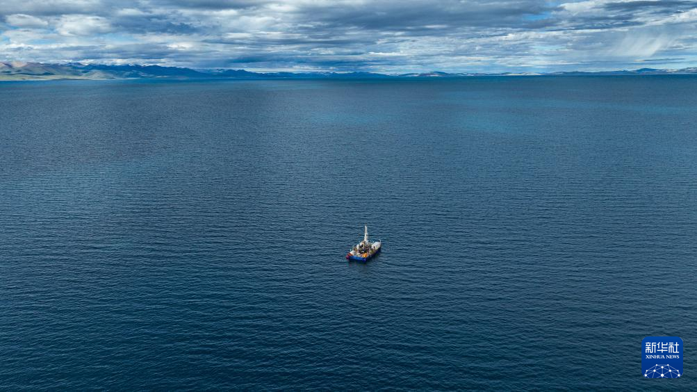 7月11日拍攝的納木錯(cuò)水上鉆探平臺(tái)(無人機(jī)照片)。